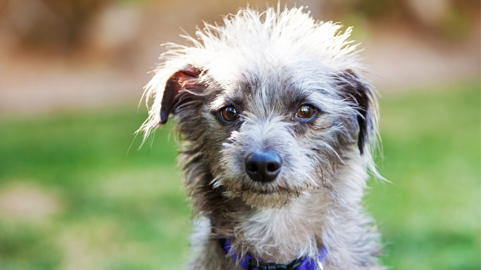 A wiry gray mutt with a crooked tail, a gentle limp, and eyes full of something old and tender.
